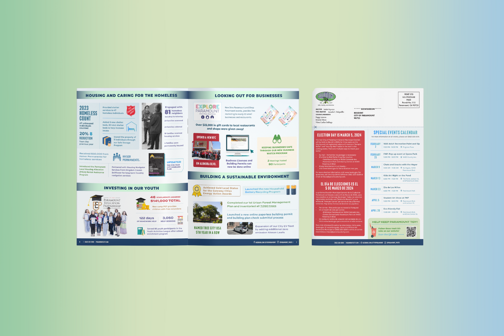 This collaborative project turned the City’s annual Year in Review into a bold, engaging, and easy-to-read 8-page booklet for residents. Designed with a strong infographic style, the layout combines eye-catching visuals, clean typography, and a well-structured grid to make key stats and achievements stand out. Bright colors, icons, and images help break down important information in a way that’s both accessible and visually appealing. With its modern, polished design, it effectively tells the City’s story in a clear and engaging way.